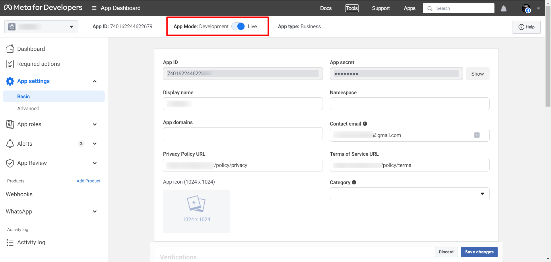 Then from the App settings, click on the Basic option and add the Privacy Policy URL and Terms of Service URL from the ZaidiPro. These URLs are available on the Connect bot page of ZaidiPro. After adding these URLs just click on the “Save changes” button.