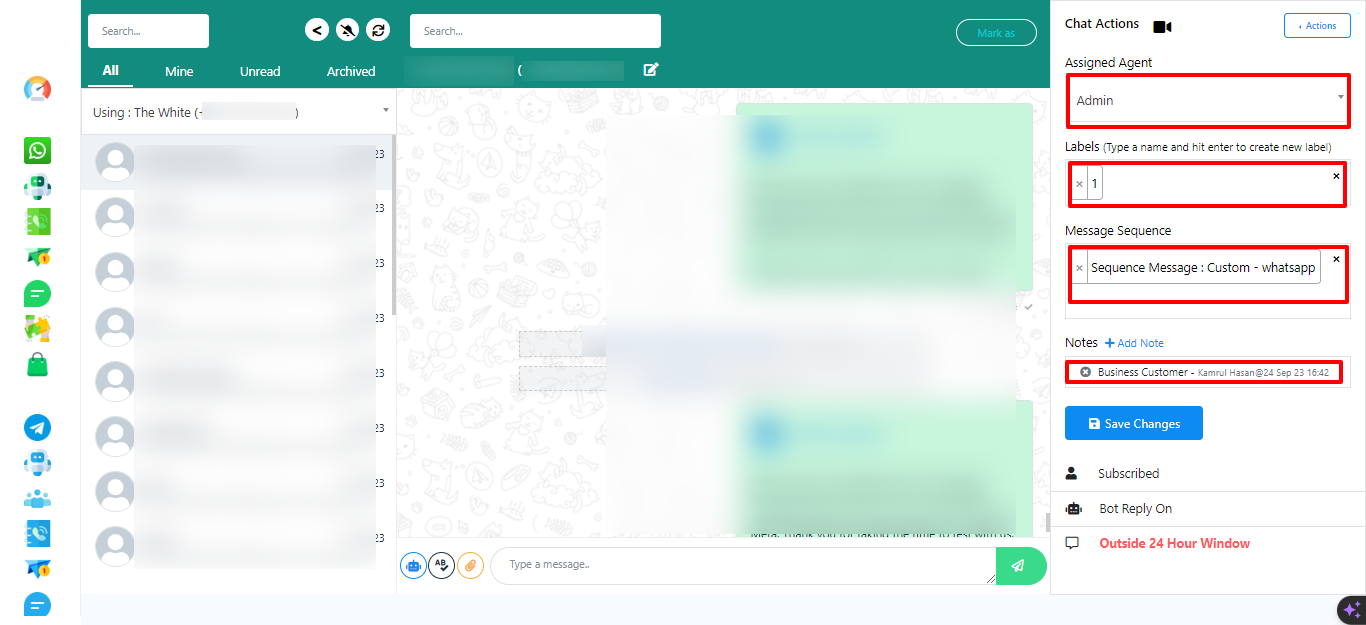 You can assign a message to your team members from the `assigned agent` section. Select an agent for the conversation and add labels and sequences if needed. Then, save it.